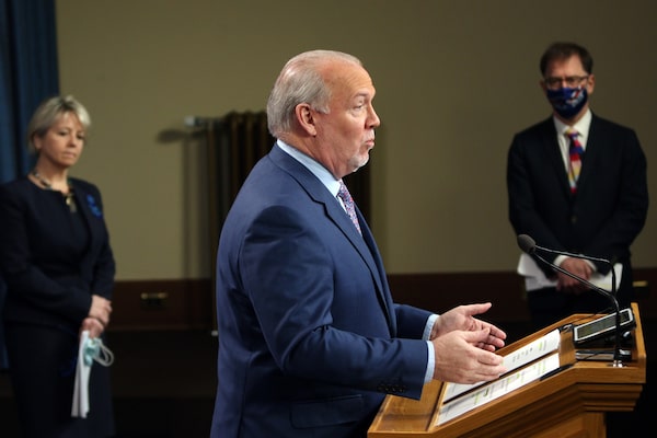 Dr. Bonnie Henry and Minister Adrian Dix look on as Premier John Horgan talks about the next steps in B.C.'s COVID-19 Immunization Plan during a press conference at Legislature in Victoria, B.C., on Jan. 22, 2021.CHAD HIPOLITO/The Canadian Press