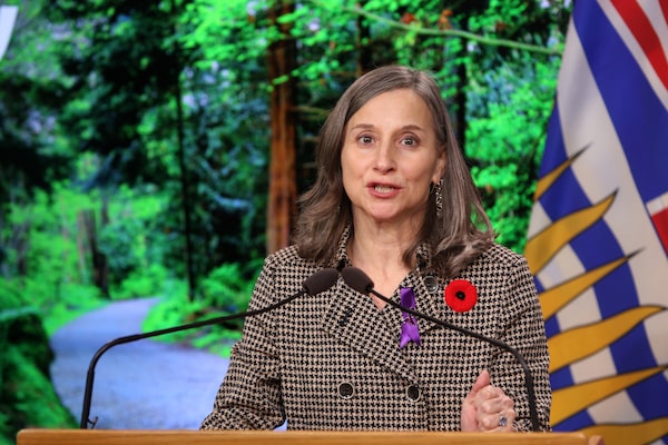 British Columbia's chief coroner Lisa Lapointe speaks during a news conference in the press gallery at the B.C. Legislature in Victoria on Nov. 1, 2021.CHAD HIPOLITO/The Canadian Press