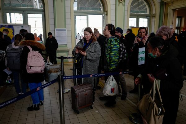 Ukrainian refugees wait in line to get train tickets in the ticket hall at Przemysl Glowny train station, after fleeing the Russian invasion of Ukraine, in Poland, April 4, 2022.KACPER PEMPEL/Reuters