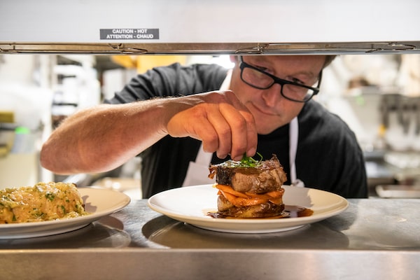 Chef Adam Pegg of La Quercia plates the mains – slow-roasted beef, braised chicken and polenta with mushrooms.EMILY COOPER
