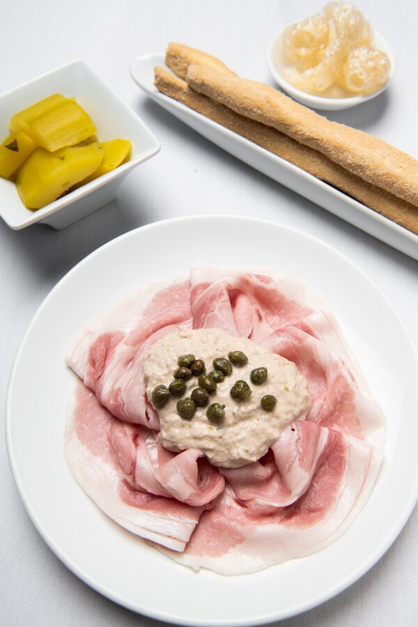 Thinly-sliced pork loin tonnato, tuna sauce deep with anchovies and garnished with a few curls of pork crackling.EMILY COOPER