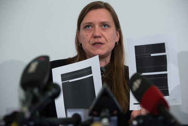 Meghan McDermott, a lawyer with the B.C Civil Liberties Association, holds a few redacted pages from the thousands disclosed by the Canadian Security Intelligence Service, during a news conference in Vancouver, on July 8, 2019.DARRYL DYCK/The Canadian Press
