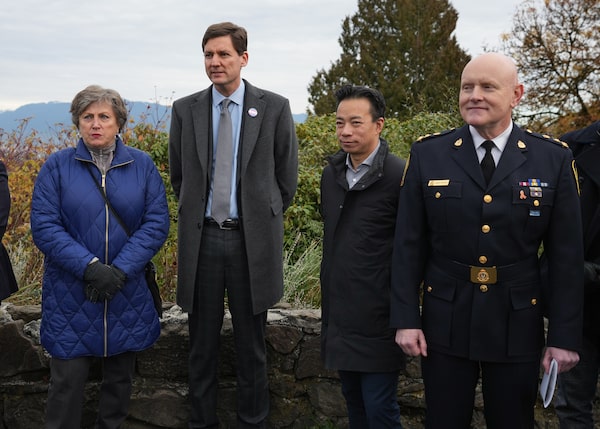 Vancouver Police Board Vice Chairperson Faye Wightman, B.C. Premier David Eby, Vancouver Mayor Ken Sim and Vancouver Police Chief Adam Palmer stand together before Eby announced a new public safety plan in Vancouver on Nov. 20, 2022.DARRYL DYCK/The Canadian Press