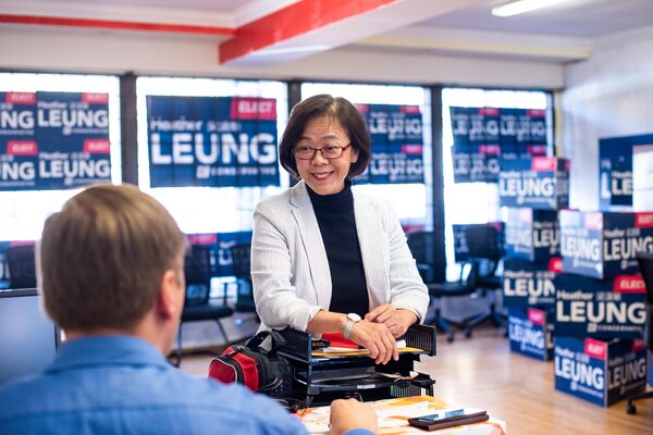 Ms. Leung’s campaign is still using Tory logos in campaign material, including lawn signs.