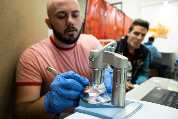 Kyle Besaw carefully tips over a small, paper cup, pouring a tiny, bluish-green pebble onto the plate of a drug-checking machine. With a metal tool, he positions the sample over a tiny crystal and lowers a clamp.