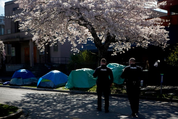 Victoria Police look on over Pandora Avenue where over a hundred homeless people are temporarily living in tents, in Victoria, on March 25, 2020.CHAD HIPOLITO/The Canadian Press