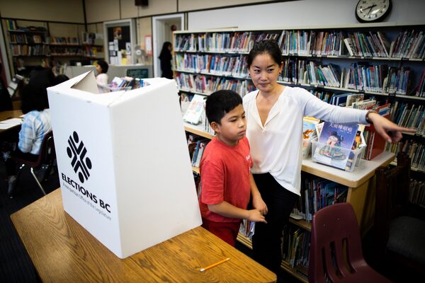 A long line of fidgety kids pours out of an elementary school library in the heart of British Columbia’s New Westminster-Burnaby riding. Each student holds either a custom-made ID card or their school planner in hand, eager to present valid identification and vote in this year’s federal election.
