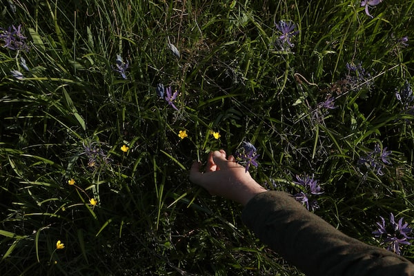 Wylie Thomas, a botanist and restoration specialist is photographed among the common camas and water-plantain buttercups and other rare species of plants in Uplands Park in Oak Bay.