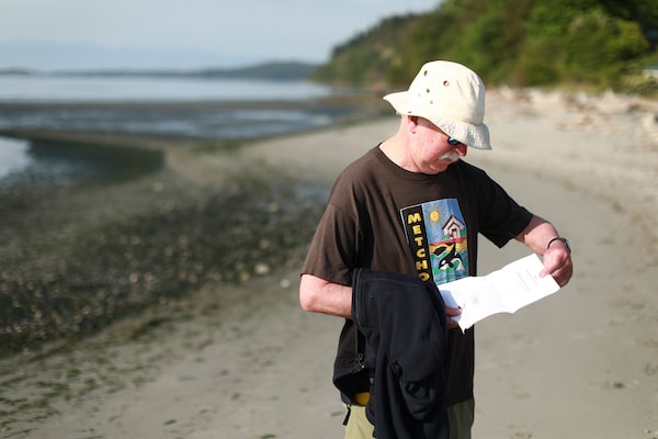 Mr. McKinnon reviews documents during Metchosin Biodiversity Project's annual count of the contorted-pod evening-primrose in Witty's Lagoon.