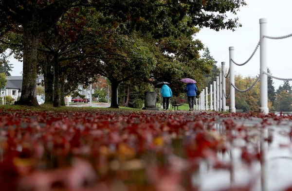 Rain falls as people walk along Gorge Rd., in Victoria, on Oct. 16.CHAD HIPOLITO/The Canadian Press