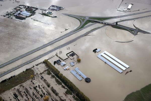Floodwaters cover a section of Highway 1 on Nov. 20 in Abbotsford, B.C. The province declared a state of emergency following record rainfall that has resulted in widespread flooding of farms, landslides and the evacuation of residents.Justin Sullivan/Getty Images