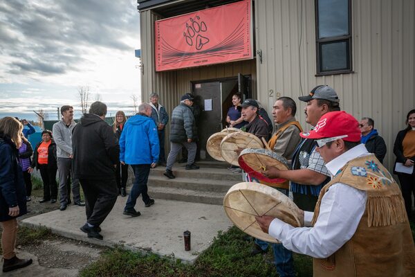 B.C. Premier John Horgan, centre, blue jacket, is drummed into the Lower Post Residential School by Kaska drummers in Lower Post, B.C. on Orange Shirt Day in 2019.Manu Keggenhoff/The Canadian Press