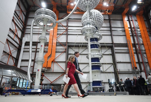 Deputy Prime Minister and Minister of Finance Chrystia Freeland and B.C. Premier David Eby arrive for a news conference after touring Powertech Labs, in Surrey, B.C., on March 30.DARRYL DYCK/The Canadian Press