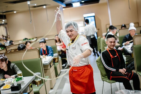And you will feel the flick of hand-pulled noodles as a young dancer in a white tracksuit spins long dough ribbons around your table and snaps them at your camera.