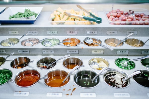 Before returning to the lobby, she poured me a glass of lemon water from a plastic pitcher affixed to the side of the table and brought us a plate of fruit from the spotless self-serve sauce bar. The oranges were unnaturally sweet and juicy. Perhaps they were sprinkled with “Gourmet Powder,” one of the dozens of condiments available. It looks like shimmery Maldon salt flakes, but is most likely MSG (monosodium glutamate).