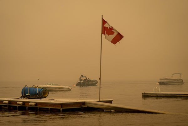 Thick smoke from the Lower East Adams Lake wildfire fills the air and a Canadian flag flies in the wind as RCMP officers on a boat patrol Shuswap Lake, in Scotch Creek, B.C., on Aug. 20.DARRYL DYCK/The Canadian Press