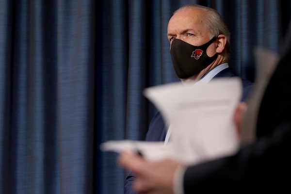 Premier John Horgan looks on during a COVID-19 press conference at the Legislature in Victoria on March 1, 2021.CHAD HIPOLITO/The Canadian Press