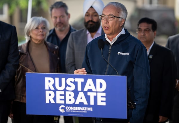B.C. Conservative Leader John Rustad speaks at an announcement in Surrey B.C., on Sept. 23. Voters in British Columbia will go to the polls for a provincial election on Oct. 19.ETHAN CAIRNS/The Canadian Press