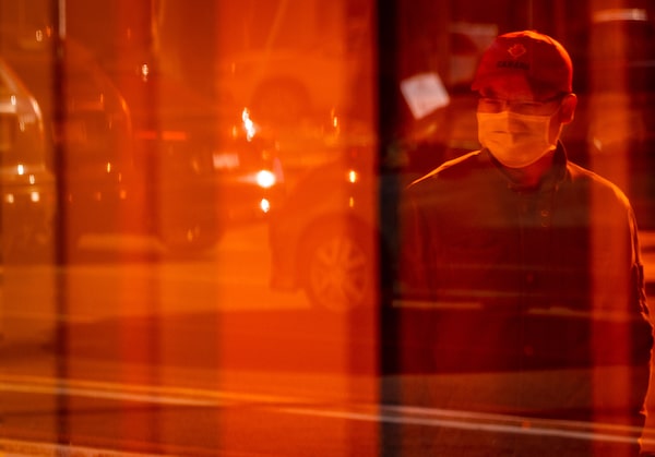 Burnaby, B.C., Feb. 7: A masked man is reflected in an orange window.Darryl Dyck/The Canadian Press