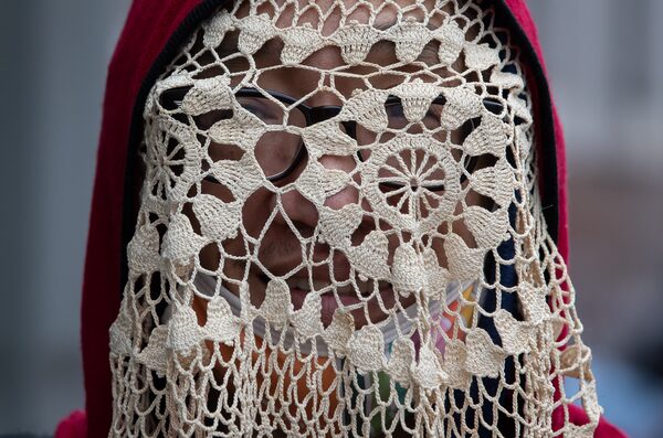 Vancouver, Jan. 27: A person waiting for a bus covers their face with a crocheted piece as their face mask is lowered.Darryl Dyck/The Canadian Press
