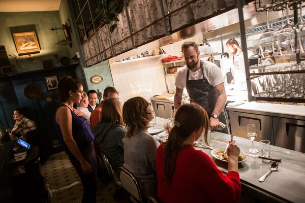 Chef-owner Jean-Christophe Poirier talks with diners sitting at the open kitchen at St. Lawrence Restaurant in Vancouver on Oct. 11, 2017. When reopening for indoor dining, Mr. Poirier made the bold decision to introduce three-course tasting menus that had to be not just reserved with a credit card, but also fully paid in advance.DARRYL DYCK/For The Globe and Mail