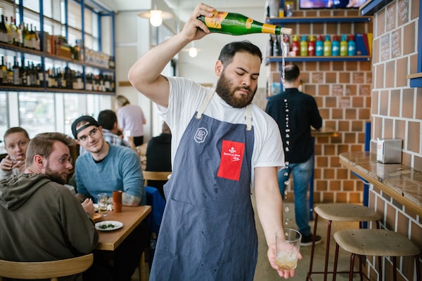 Bartender Camilo Romero pours a Bereziartua cider at Como Taperia in Vancouver on March 25, 2019. The restaurant has come to expect six to 12 no-shows every night and has recently started charging groups of six of more $25 a head for cancellations without a 24-hour notice.BEN NELMS