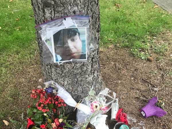 A memorial for Traevon Desjarlais-Chalifoux sits outside the Abbotsford. B.C., group home where he died.Supplied