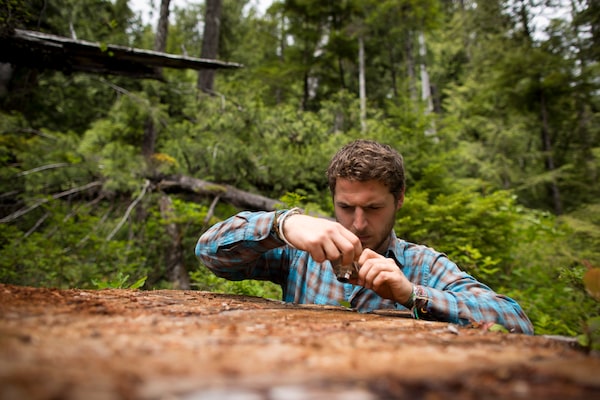 Conservationist Torrance Coste counts the rings of what remains of an 800 year-old redcedar at Carmanah-Walbran Provincial Park on Vancouver Island on June 21, 2012.John Lehmann/The Globe and Mail