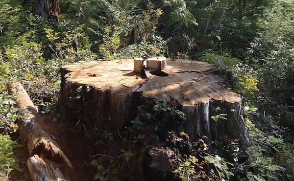 The stump of what is said to have been a 800-year-old redcedar that was cut down near the entrance of Carmanah-Walbran Provincial Park on Vancovuer Island, B.C. photographed on May 5, 2012.Torrance Coste/The Canadian Press