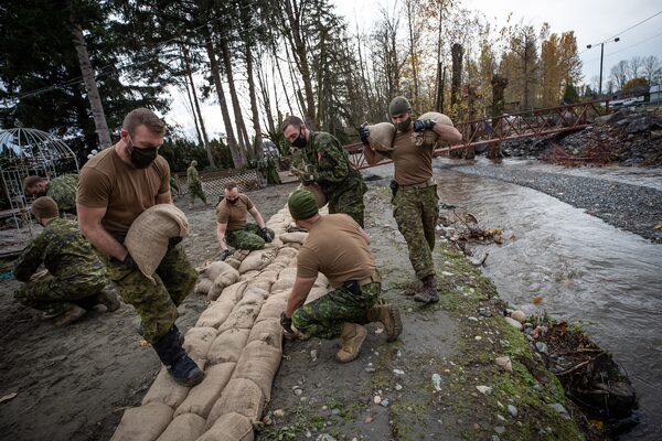 A member of the Canadian Forces carries sandbags while building a temporary dike behind houses along Clayburn Creek ahead of a rainfall warning Environment Canada has forecast for the region, which is already affected by flooding, in Abbotsford, B.C., on Nov. 24.DARRYL DYCK/The Associated Press