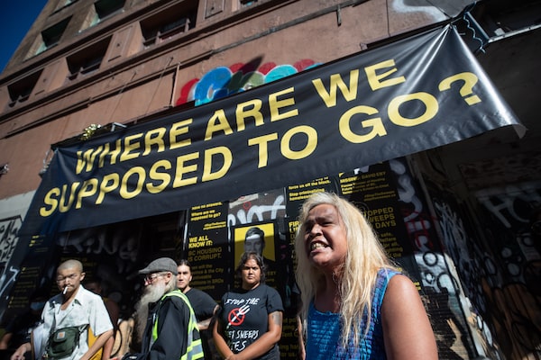 A woman addresses the crowd during a protest against the city's ongoing removal of a homeless encampment on the sidewalks in the Downtown Eastside of Vancouver on Aug. 16.DARRYL DYCK/The Canadian Press