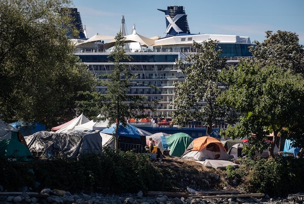 Tents and people at a homeless encampment at Crab Park as the Celebrity Cruises vessel Celebrity Eclipse is docked at port in Vancouver, on Aug. 14, 2022.DARRYL DYCK/The Canadian Press