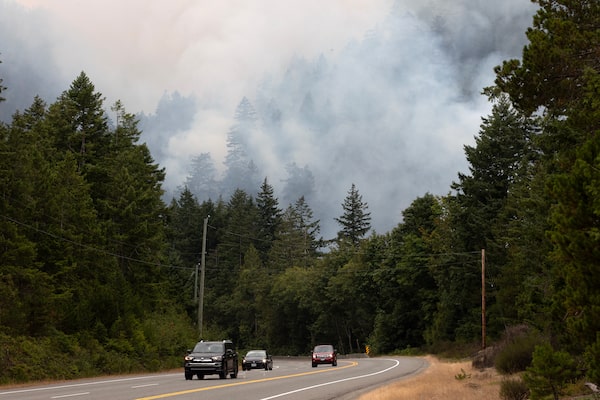 Traffic leaves the area along highway 4 below the Wesley Ridge wildfire at Cameron Lake near Coombs, B.C., on Sunday.CHAD HIPOLITO/The Canadian Press