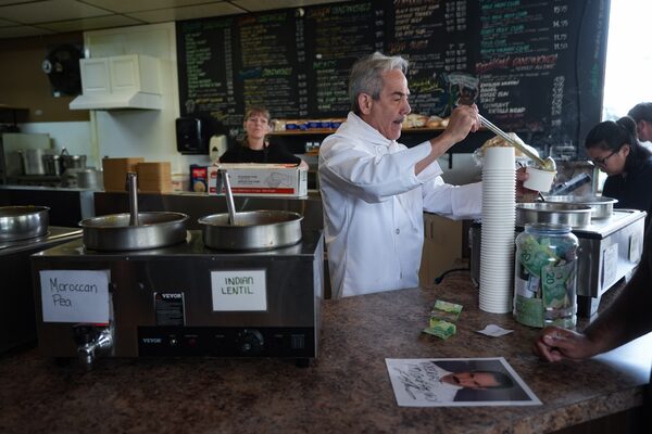 Actor Larry Thomas serves soup during a fundraiser for victims of last month's attack on Vancouver's Lapu Lapu Day festival, at Greens and Beans Deli, in New Westminster, B.C., on May 25. Thomas said the April 26 attack that killed 11 people was a 'terrible thing,' prompting him to reprise his fundraising relationship with the deli that stretches back 20 years.DARRYL DYCK/The Canadian Press