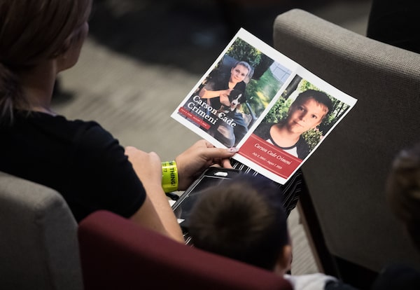 A woman holds a program bearing photographs of Carson Crimeni during a celebration of life for the late 14-year-old in Langley, B.C., on Aug. 29, 2019.DARRYL DYCK/The Canadian Press