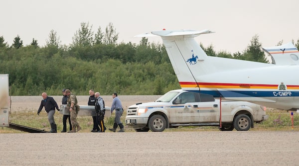 RCMP officers carry metal boxes with the suspects' remains to waiting planes in Gillam, Man., on Aug. 7.Melissa Tait / The Globe and Mail/The Globe and Mail