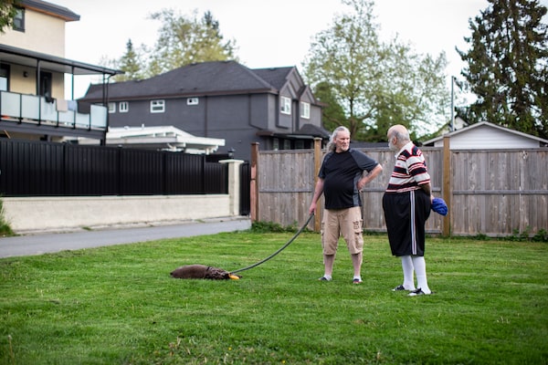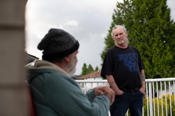 Mr. Usher chats with Irving Richter on the back deck of the home they share with three other seniors on income assistance in Surrey, B.C. Though he’s not a family member to any of his roommates, Mr. Usher still falls under the umbrella of 'caregiver'.Jesse Winter/The Globe and Mail