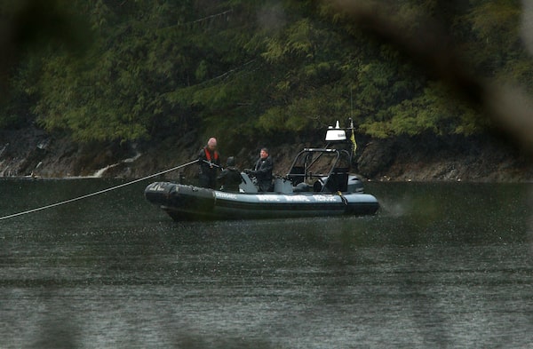 Fisheries Department Pacific region marine mammal co-ordinator Paul Cottrell operates a zodiac with other experts as they conduct work in an area where an orphaned two-year-old female orca calf continues to live in a lagoon near Zeballos, B.C., on April 11.CHAD HIPOLITO/The Canadian Press
