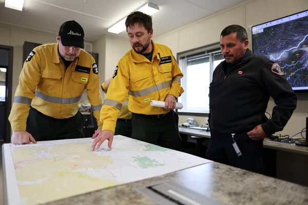 Alberta Wildfire Operations Section Chief Derek Gough, Incident Commander Gavin Hojka and Regional Municipality of Wood Buffalo Incident Commander Darren Clarke discuss firefighting strategy during a media tour of the incident command post two days after a wildfire caused the evacuation of communities on the southern edge of Fort McMurray, Alta., on May 16.Jesse Winter/Reuters