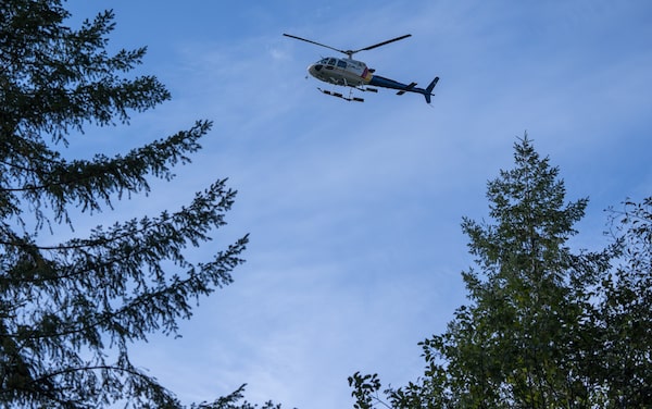An RCMP helicopter patrols the Fairy Creek logging area near Port Renfrew, B.C., on Oct. 4, 2021.JONATHAN HAYWARD/The Canadian Press
