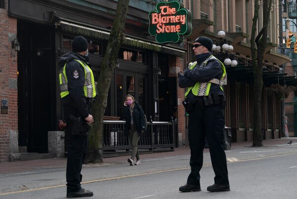 Members of the Vancouver Police Department outside an Irish Pub in downtown Vancouver on March 17, 2021. B.C. Premier John Horgan said businesses worried about belligerent patrons refusing to show the requisite proof of coronavirus immunization could call law enforcement.JONATHAN HAYWARD/The Canadian Press