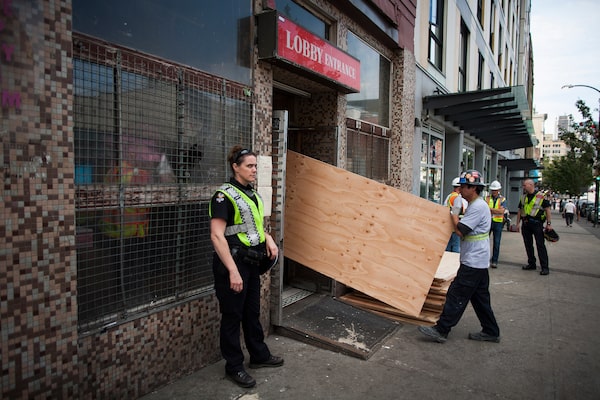 Workers prepare to board up the Regent Hotel in Vancouver's Downtown Eastside, on June 20, 2018.Rafal Gerszak