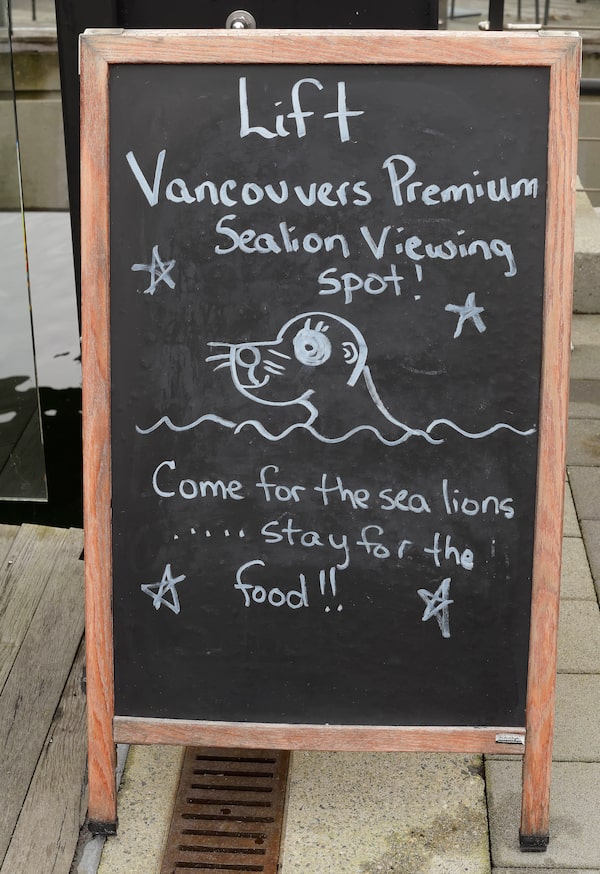 Across the harbour from the rowing club, Lift Bar Grill View has a sign welcoming visitors hoping to see the sea lions.