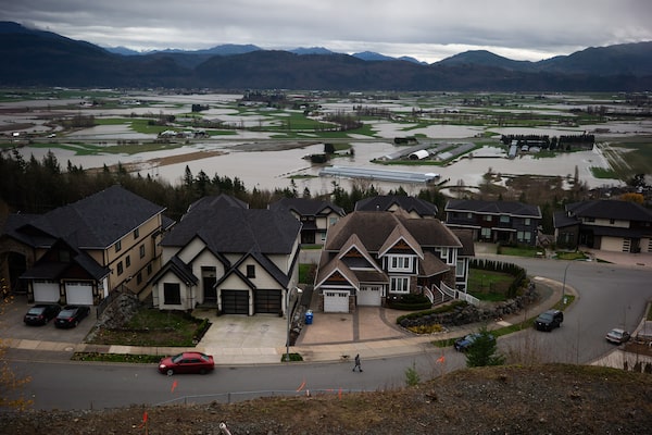 A person walks a dog in a residential neighbourhood on a mountain overlooking flooded farmland in Abbotsford, B.C., on Wednesday, December 1, 2021. THE CANADIAN PRESS/Darryl DyckDARRYL DYCK/The Canadian Press
