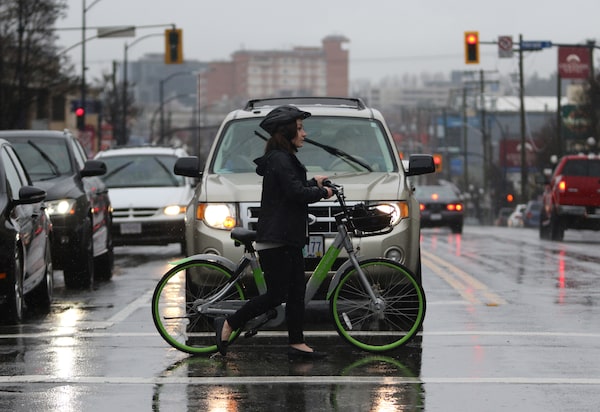 A U-Bicycle rider crosses Douglas St. in Victoria, B.C. on Jan. 29, 2018.CHAD HIPOLITO/GM