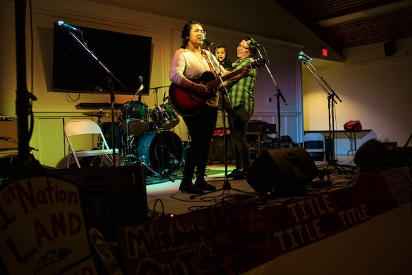 At a benefit concert in nearby Smithers, seen here on Feb. 22, 2020, hand-painted signs in black and red – 'Reconciliation Not Bullets' and 'Fracking gashole. Your backyard is next' – were given to the crowd.Jimmy Jeong/Jimmy Jeong/www.jimmyshoots.com