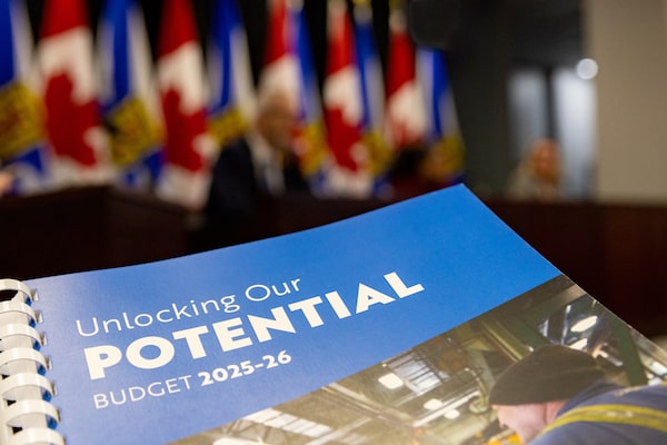 A copy of the provincial budget is displayed as Nova Scotia Finance Minister John Lohr attends a media briefing in Halifax on Feb. 18.Kelly Clark/The Canadian Press