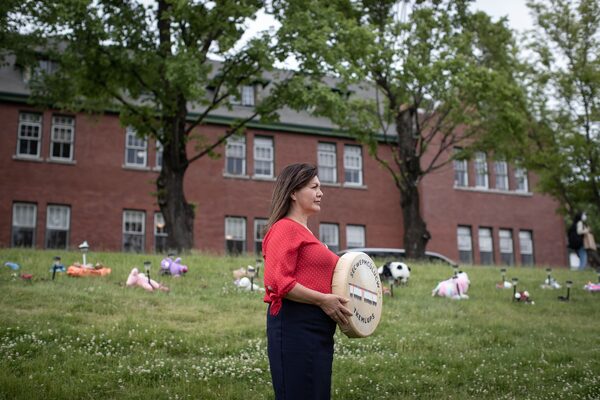 Tk'emlups te Secwepemc Chief Rosanne Casimir stands outside the former Kamloops Indian Residential School after speaking to reporters, in Kamloops, B.C., on June 4, 2021.DARRYL DYCK/The Canadian Press