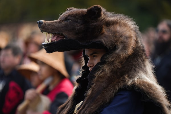 A man wears a bear hide while listening during a homecoming celebration for the House of Ni'isjoohl memorial totem at the Nisga'a Nation, in Laxgalts'ap, B.C., on Sept. 29.DARRYL DYCK/The Canadian Press