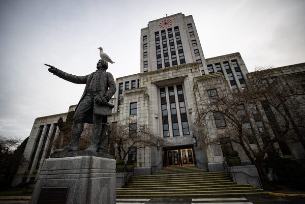 A seagull stands atop a statue of Captain George Vancouver outside Vancouver City Hall, in January, 2021.DARRYL DYCK/The Canadian Press